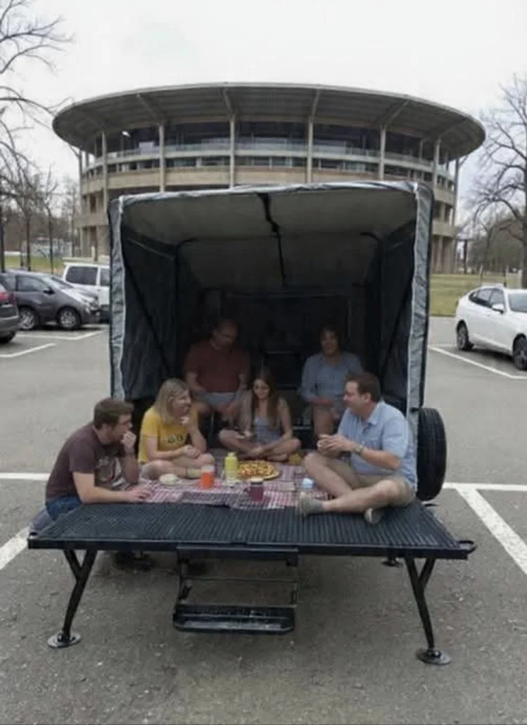 The loading ramp folds down into a front porch/deck area. Ideal for relaxing, unloading gear, or staging equipment.